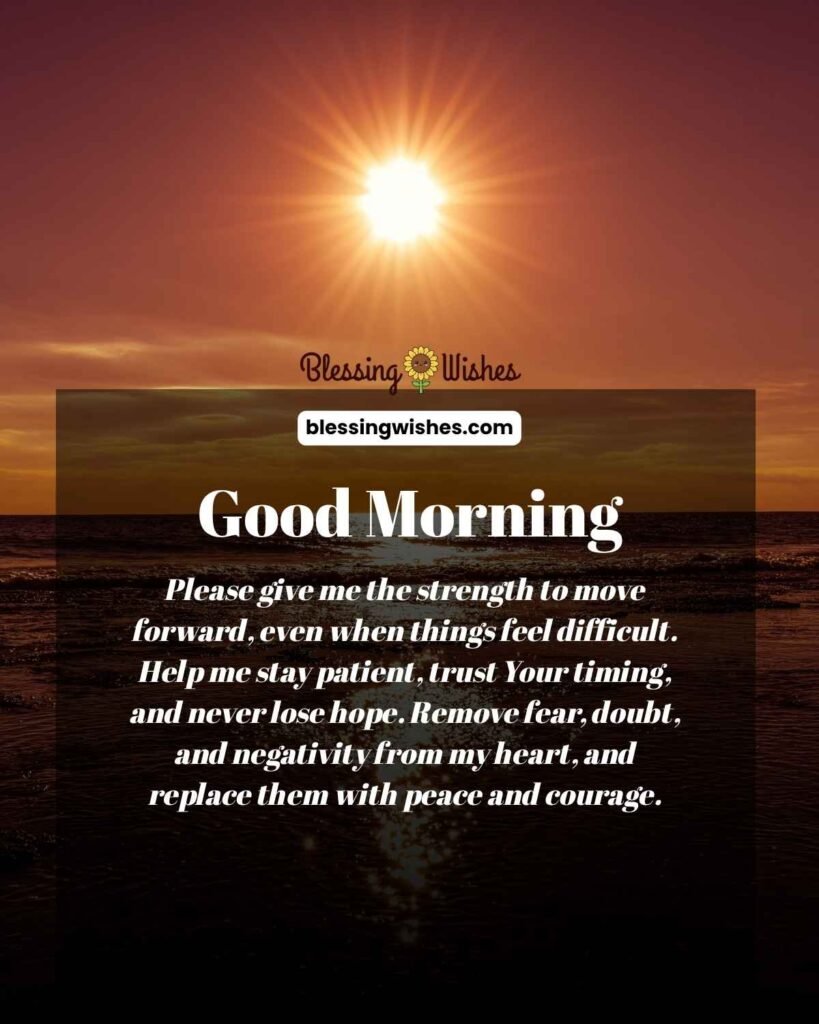 Please give me the strength to move forward, even when things feel difficult. Help me stay patient, trust Your timing, and never lose hope. Remove fear, doubt, and negativity from my heart, and replace them with peace and courage.